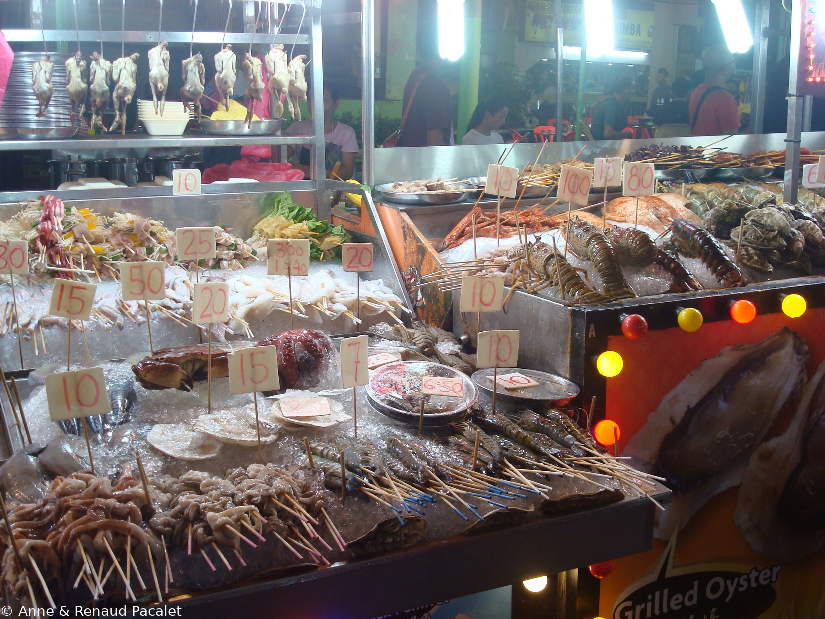 Toujours Kuala Lumpur, sous un soleil parfois un peu voilé mais assez chaud. Hier soir nous avons dîné dans la rue Jalan Alor bordée de restaurants de chaque côté, presque sans interruption sur au moins 500 mètres. De quoi nourrir une armée. Ça tombe bien, il y avait un monde fou. On a choisi une gargote barbecue. On y sélectionne ses brochettes de légumes, viande ou fruits de mer parmi les dizaines proposées et on vous les cuit en 10 minutes. C’était parfait.